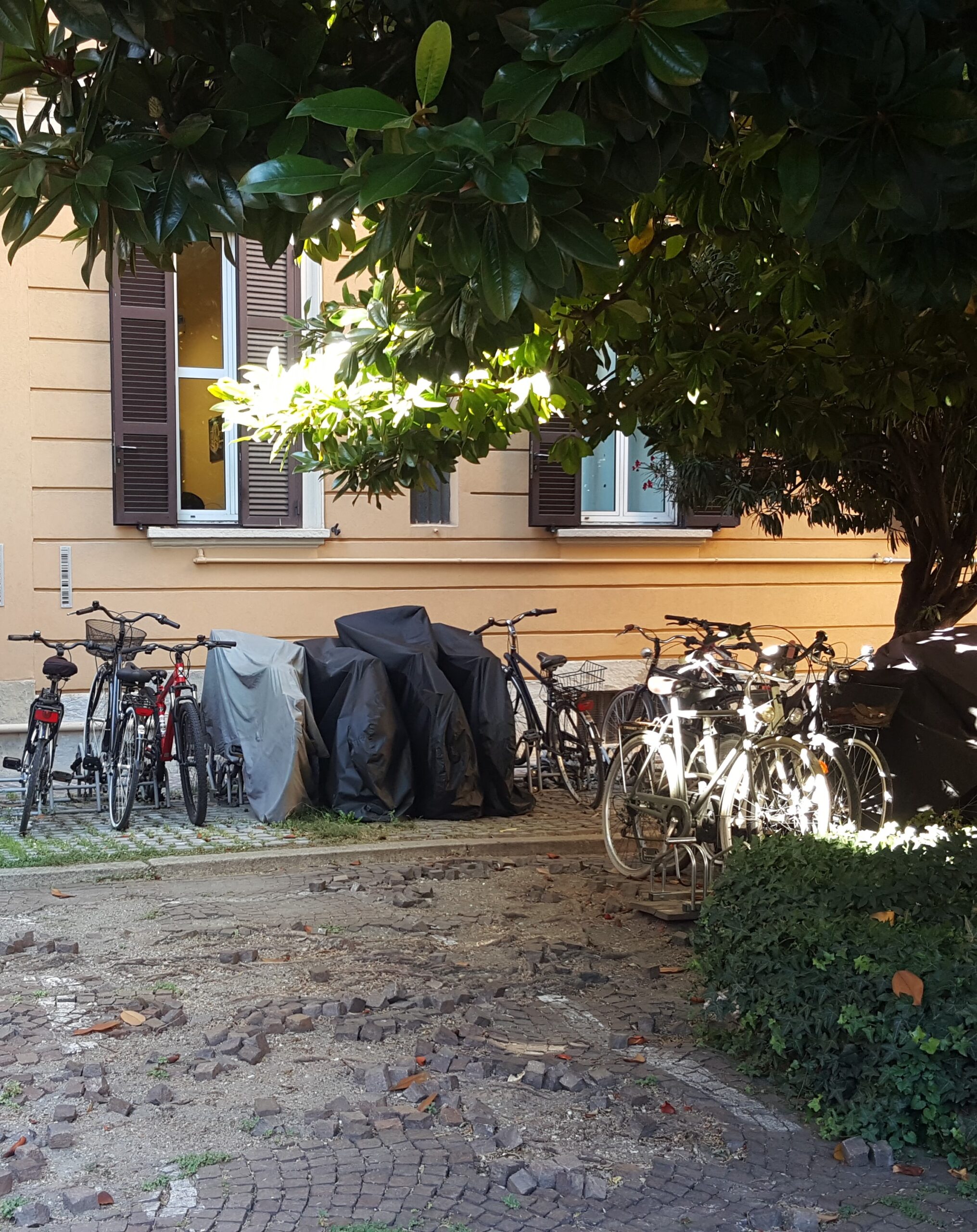 Nell’ampio e alberato cortile ci sono i posti bici con rastrelliera