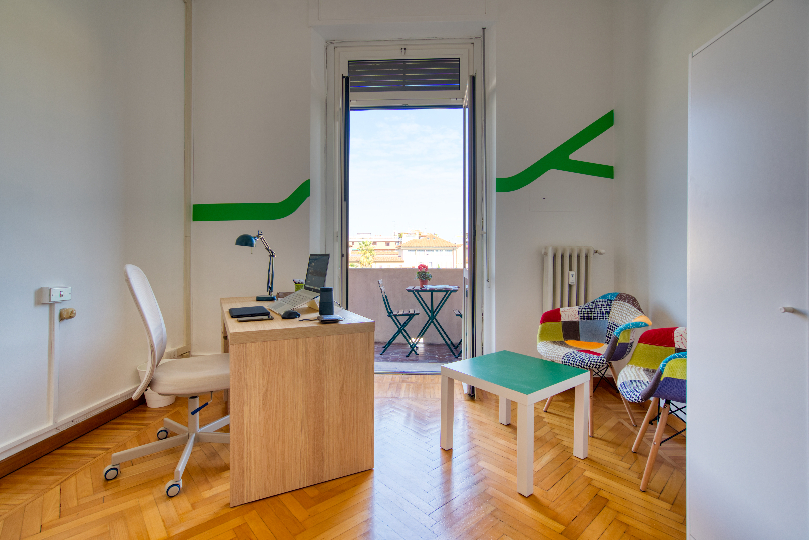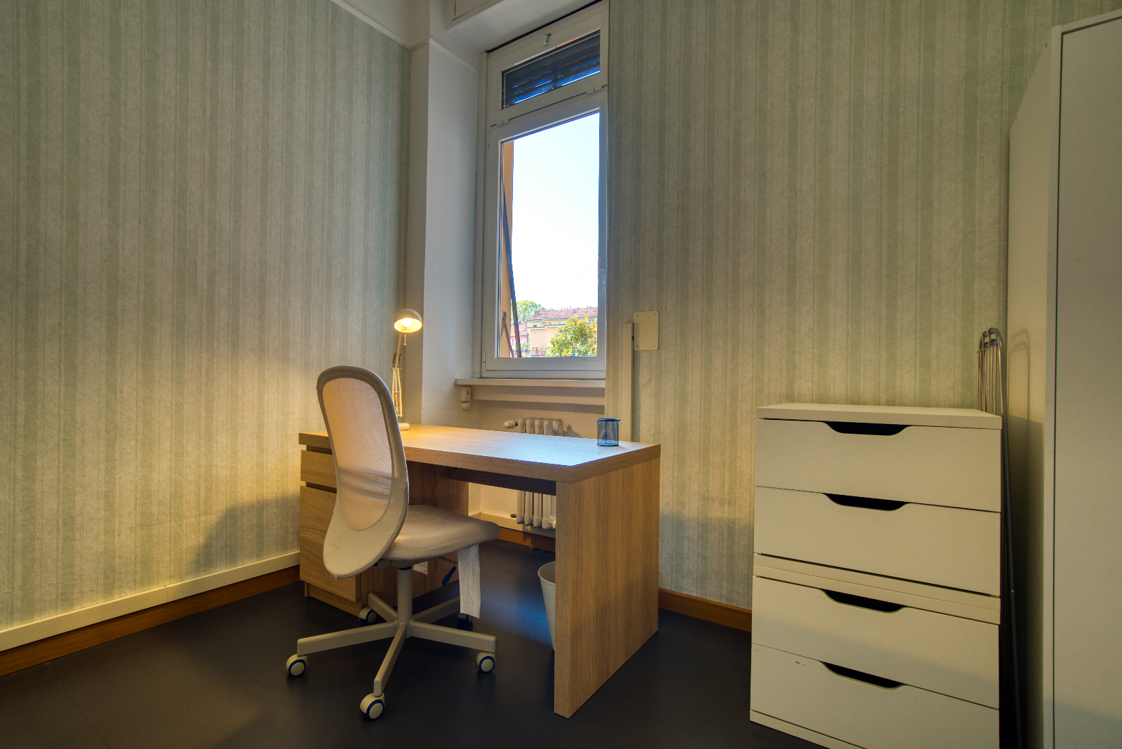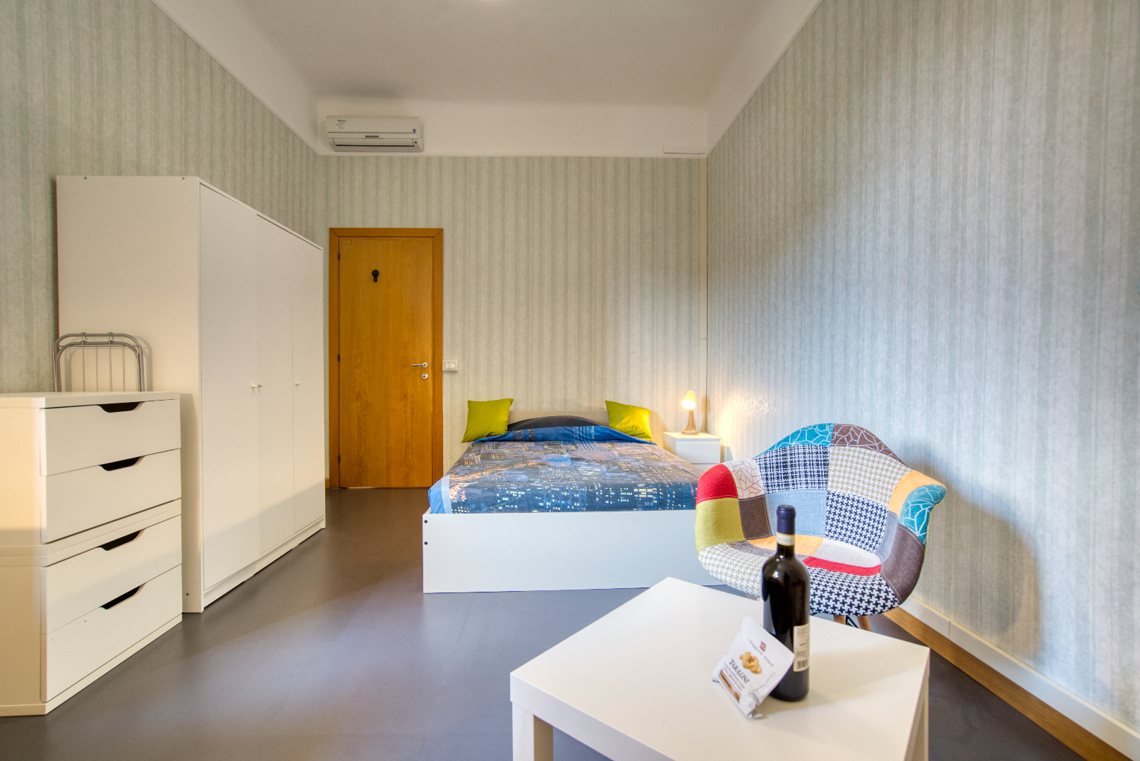 Gli ambienti sono decorati con i colori delle differenti linee della metropolitana da cui traggono il nome. Ogni stanza è perfettamente arredata per tutte le esigenze di un lavoratore/una lavoratrice, anche in smart working o di uno studente/una studentessa che voglia vivere vicino all’università e godere comunque dei vantaggi di vivere in centro avendo un ampio spazio privato. Oltre al comodo letto di una piazza e mezza, all’ampia scrivania e al resto dei mobili, in ogni camera sono presenti anche un tavolino e 2 poltroncine (le sedie in foto verranno sostituite con 2 poltroncine) per i momenti di relax anche in compagnia.