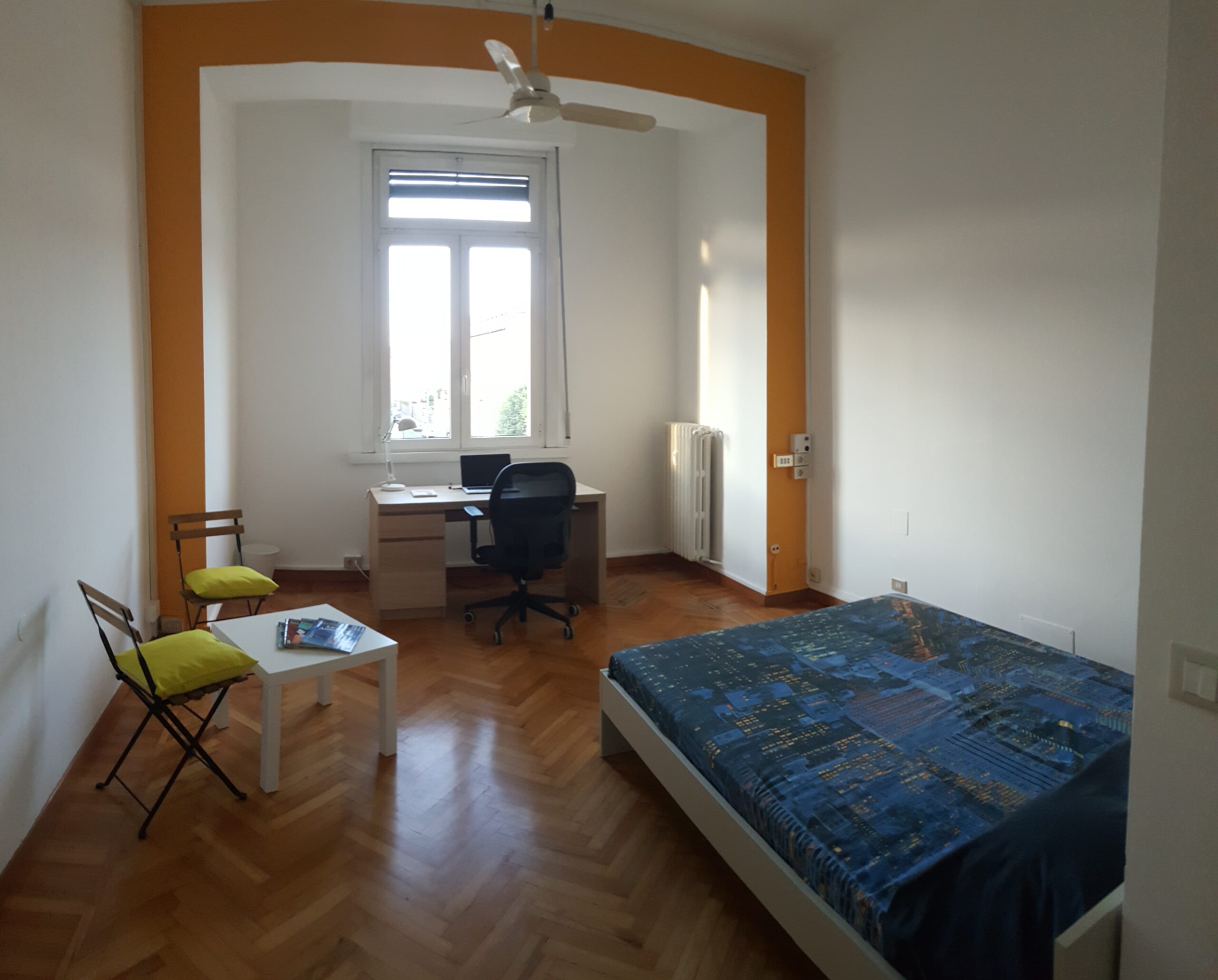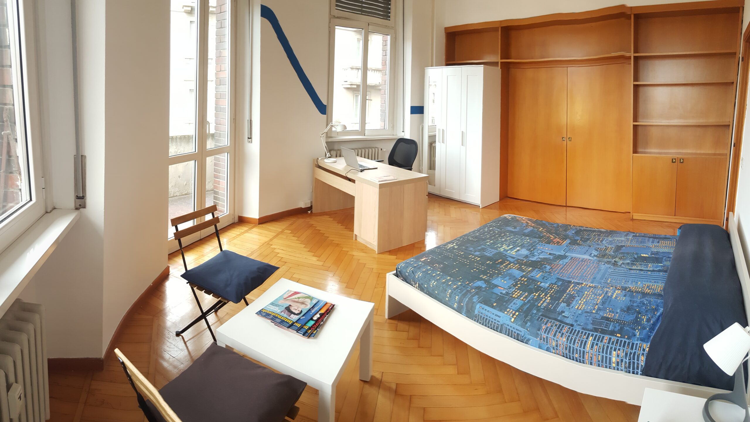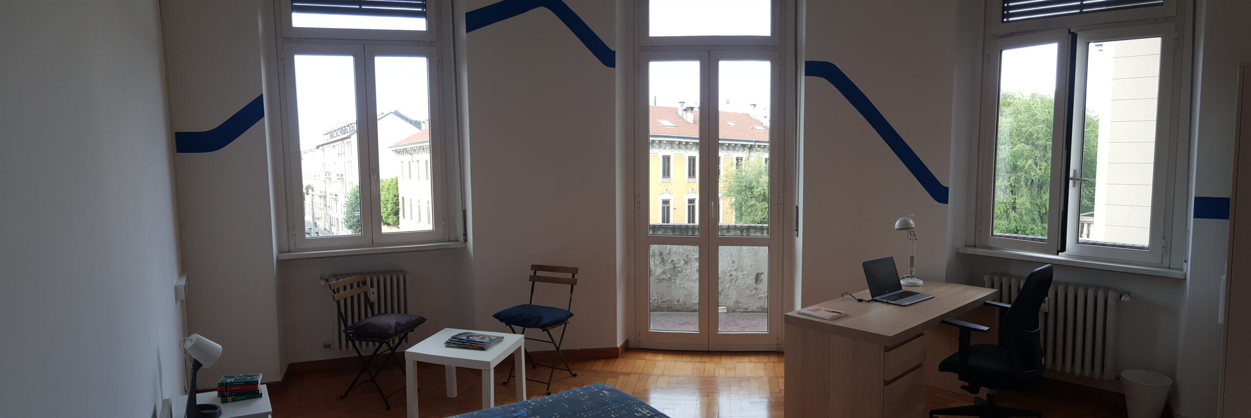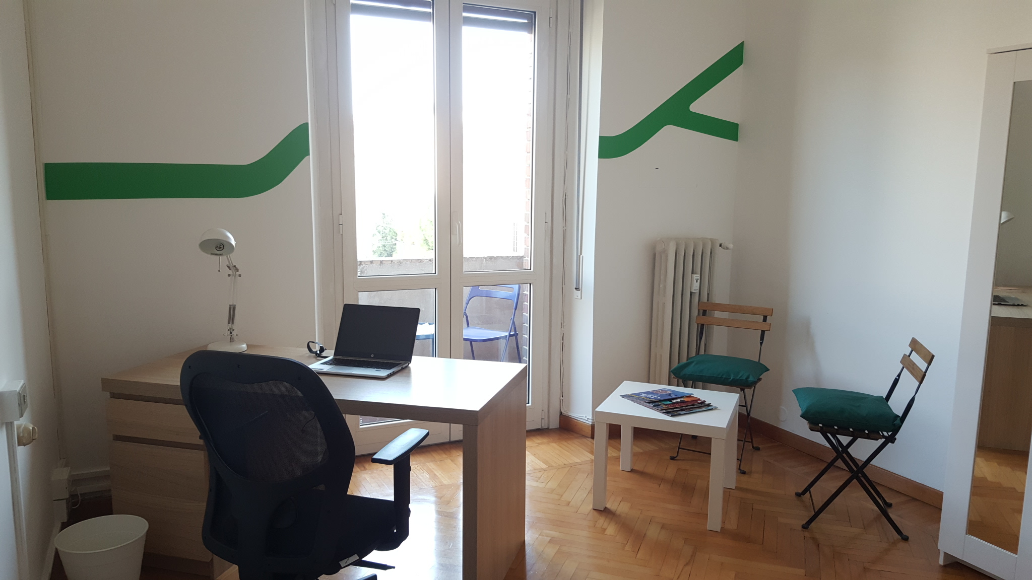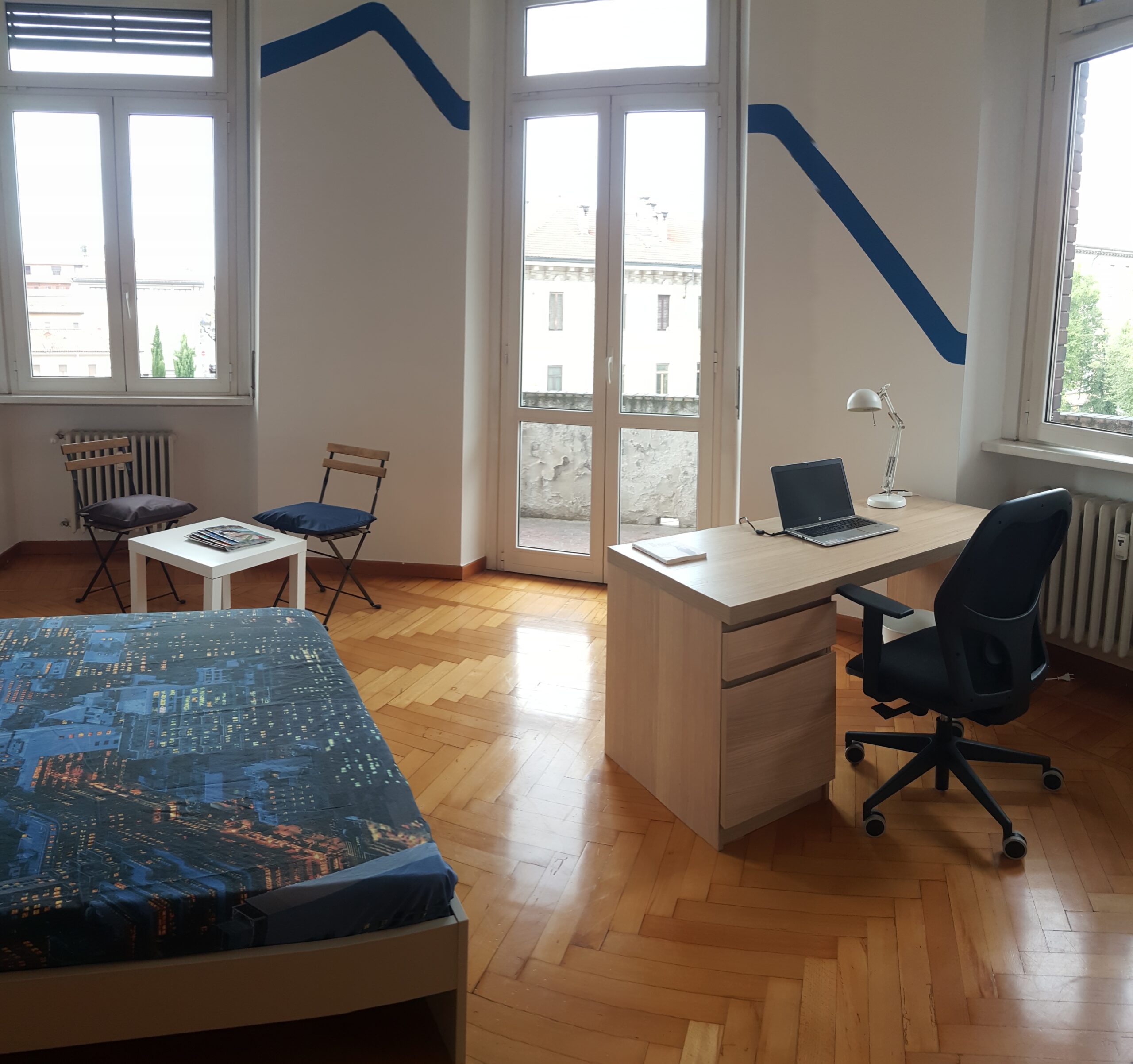 Mini suites are decorated with the colors of the local underground lines that give names to the rooms. Each one is fully furnished for the needs of young workers in smart working or for university students that want to take the advantage of a wide private space in the city centre. Equipment includes 1 wide bed, 1 desk with study chair, 1 wardrobe and a lounge table with 2 sofa chairs for private relaxing moments (chairs in the picture will be replaced by 2 sofa chairs).