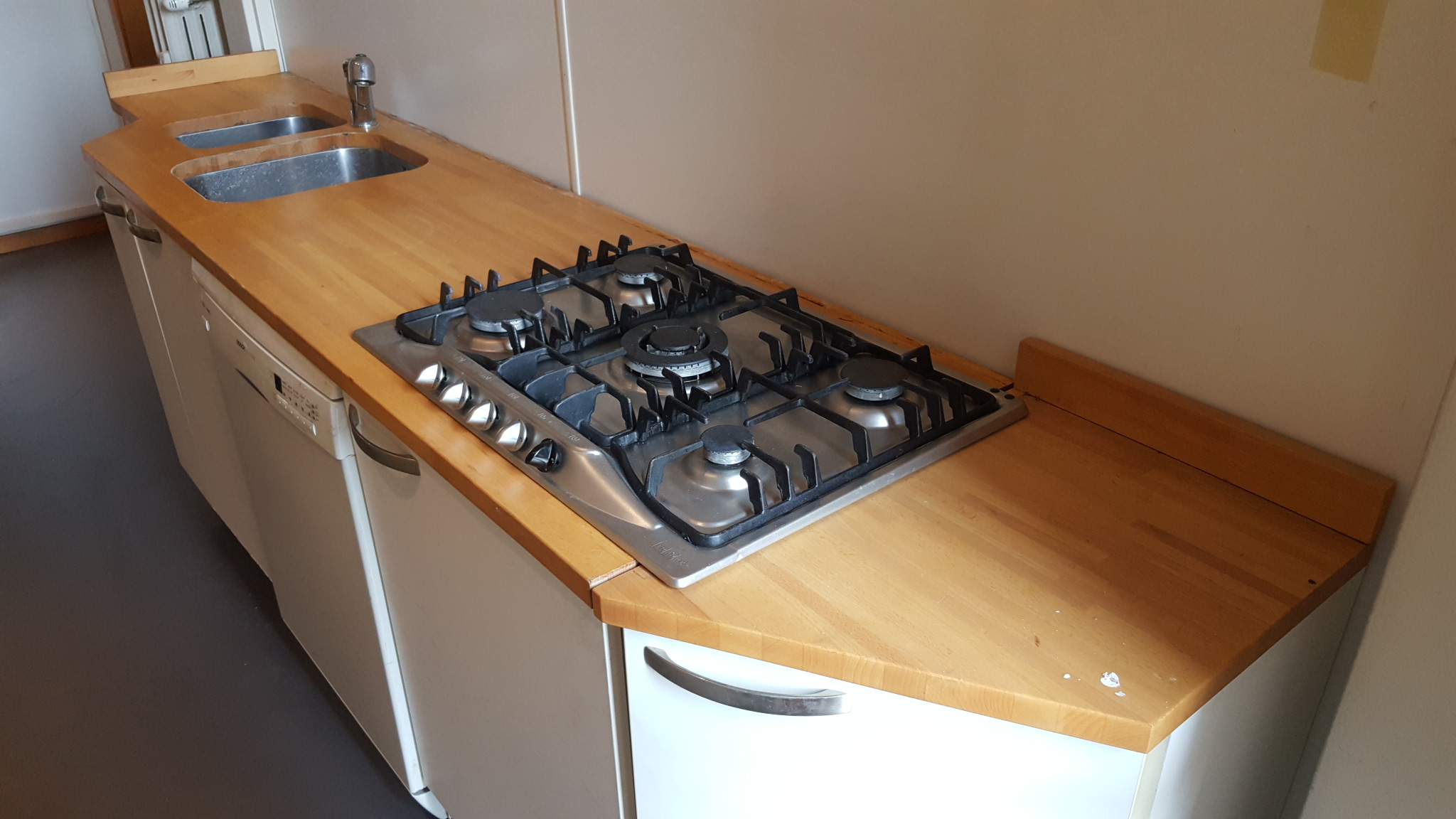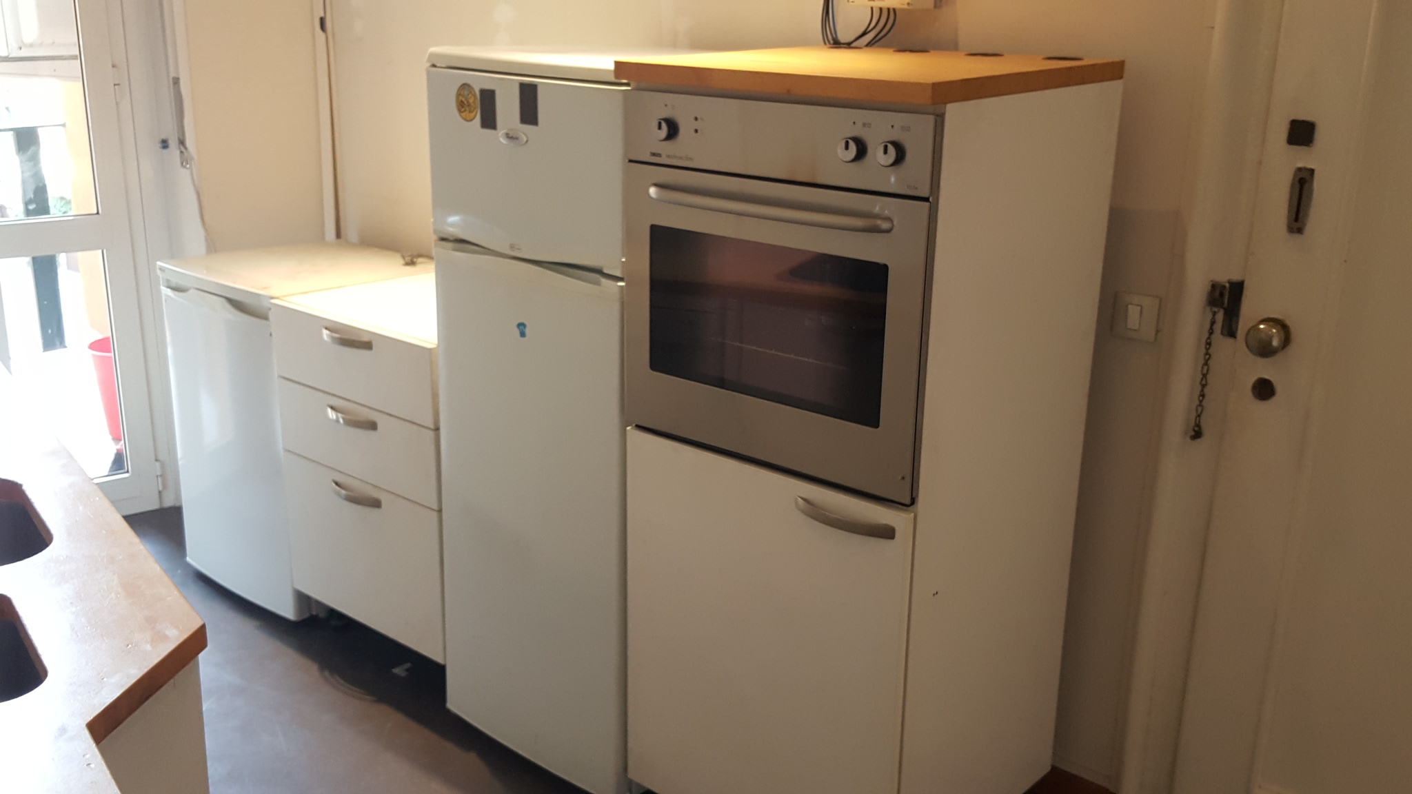 • Stove, electric oven, microwave oven, 2 fridges, dishwashing machine, pots, dishes, glasses, cutlery